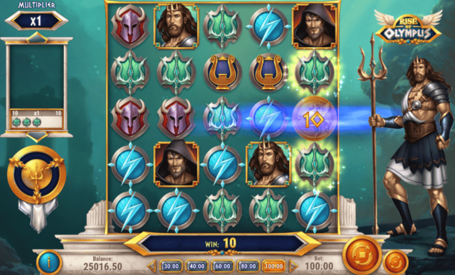 Each spin is a clash between Zeus, Poseidon, and Hades, who all have their own powers: Zeus zaps symbols, Poseidon floods wilds onto the reels, and Hades burns up rows in chaos.